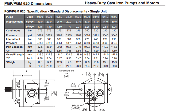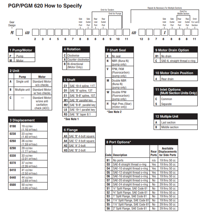 單個(gè)Parker PGP620系列泵有12種排量,從16cc / rev到52cc / rev:PGP620A-0160 | PGP620A-0190 | PGP620A-0230 | PGP620A-0260 | PGP620A-0290 | PGP620A-0330 | PGP620A-0360 | PGP620A-0370 | PGP620A-0410 | PGP620A-0440 | PGP620A-0500 | PGP620A-0520