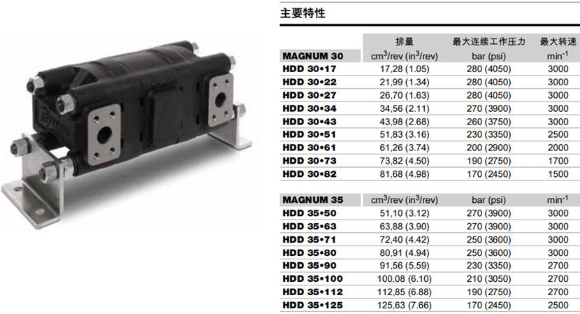排量范圍:從17,28 cm3/rev (1.05 in3/rev) 到125,63 cm3/rev (7.66 in3/rev);分30, 35兩個(gè)規(guī)格