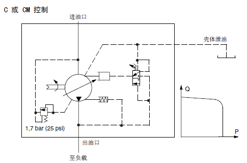 彈簧腔(控制)壓力與出口壓力之間隔著一個(gè)內(nèi)部節(jié)流孔。當(dāng)節(jié)流孔壓降達(dá)到壓差設(shè)定值時(shí)出口壓力使閥芯移動(dòng),泵排量減小。