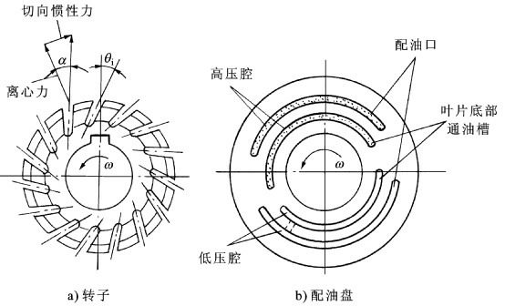 上述工作原理表明,改變定子與轉(zhuǎn)子偏心距的方向也就改變了泵的吸、壓油口,即原來的吸油口變成壓油口,原來的壓油口變成吸油口;改變上述偏心距的大小意味著改變了泵的排量。 當(dāng)偏心量為零時,密封容腔不會有容積變化,因此也就不具備液壓泵的工作條件了。同樣道理,為了使葉片運(yùn)動自如、減小磨損,葉片槽通常向后(注意,這里與雙作用葉片泵不同)傾斜20o~30o。 圖3.20為單作用 葉片泵的配油盤和轉(zhuǎn)子結(jié)構(gòu)簡圖。